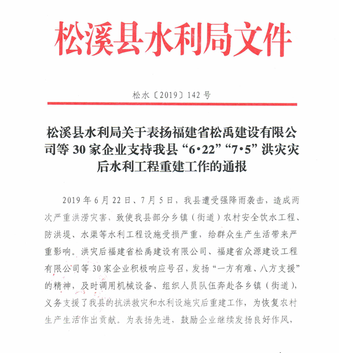 松水〔2019〕142号松溪县水利局关于表扬30家企业支持我县“6•2