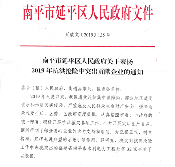 延平区人民政府关于表扬2019年抗洪抢险中突出贡献企业的通知(1)